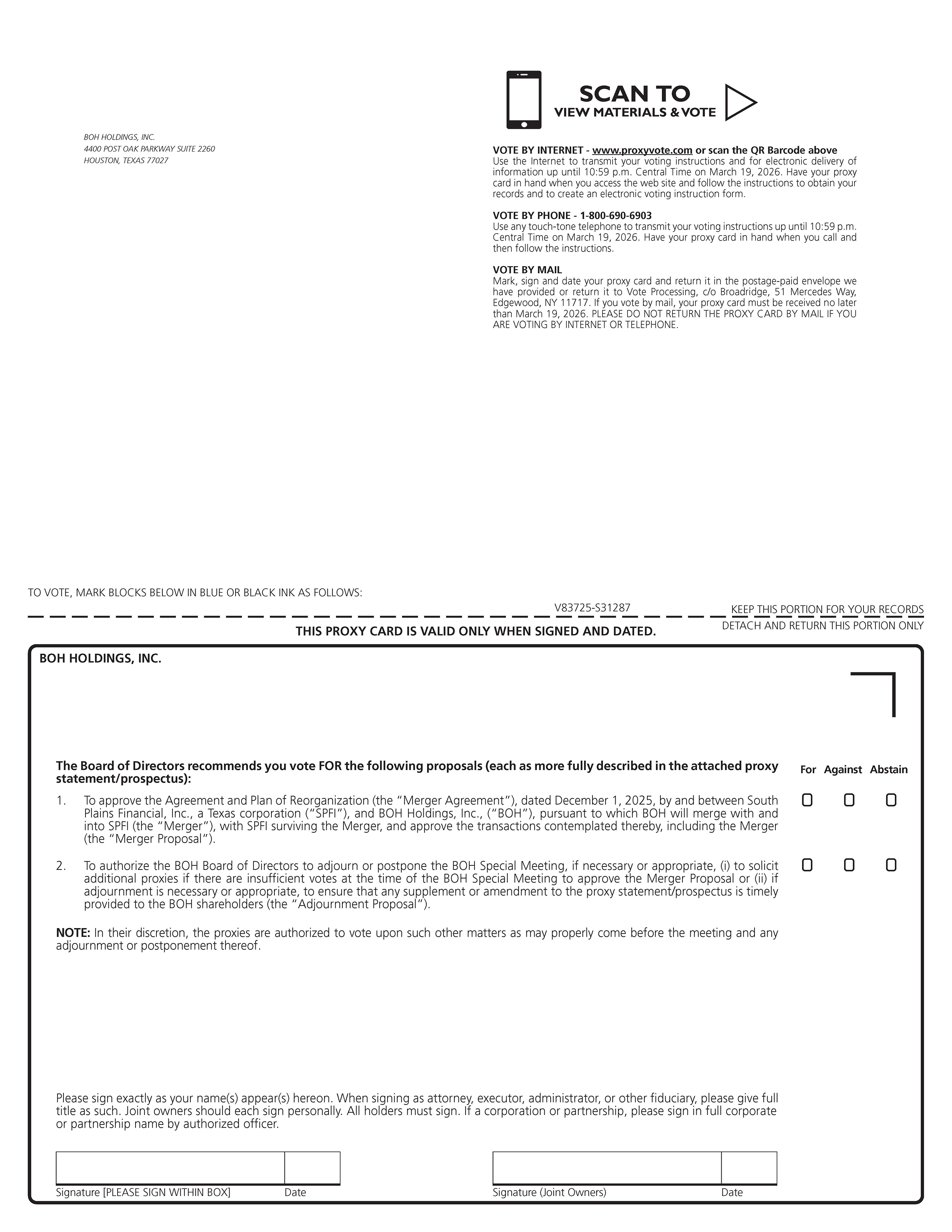 • | a proposal to approve the Agreement and Plan of Reorganization, dated December 1, 2025 (which we refer to as the “merger agreement”), by and between South Plains Financial, Inc. (which we refer to as “SPFI”) and BOH (a copy of which is attached as Annex A to the accompanying proxy statement/prospectus), pursuant to which BOH will merge with and into SPFI (which we refer to as the “merger”), with SPFI surviving the merger, and approve the transactions contemplated thereby, including the merger, each as more fully described in the accompanying proxy statement/prospectus (which we refer to as the “BOH merger proposal”); and |